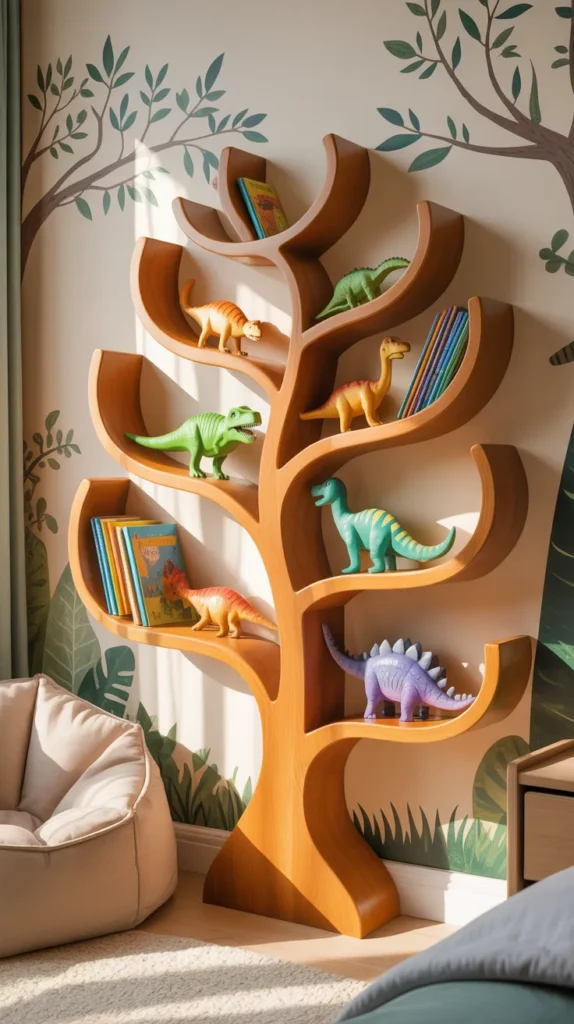 This design combines a tree structure with dinosaur figures placed on branches. The shelves spread out like branches, creating a natural and playful look. Plywood gives it strength and durability.