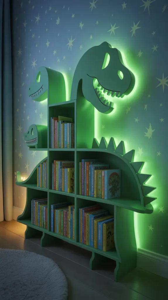 A glow-in-the-dark dinosaur shelf adds a magical touch at night. MDF shelves can be painted with glow paint for a soft lighting effect.