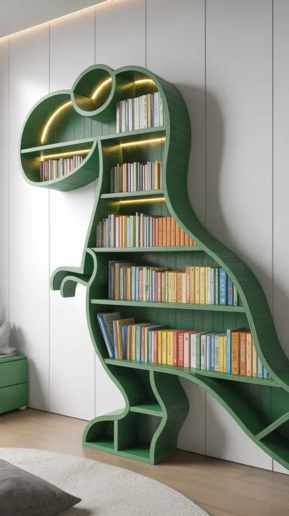A T Rex-shaped bookshelf is one of the most exciting options for kids. The body of the dinosaur forms the main structure, while the back and tail act as shelves. Made from MDF, this design is lightweight and easy to place in any room.