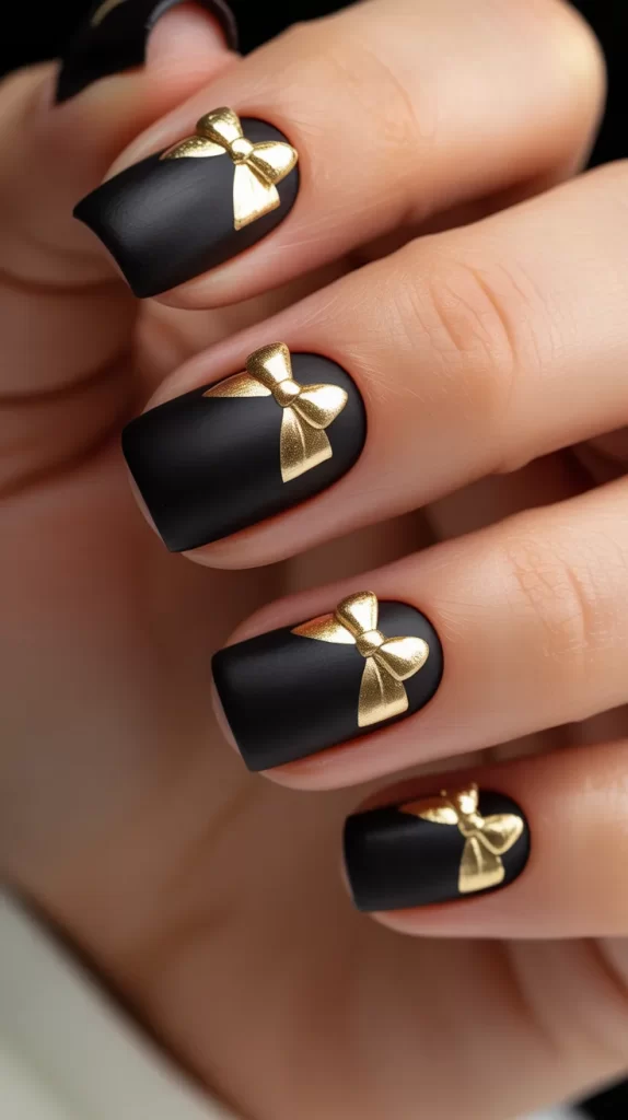 For a sophisticated twist, paint your nails matte black. Then, use gold nail polish or foil to draw small bow shapes at the base or tips of your nails. The contrast of black and gold looks elegant and modern.