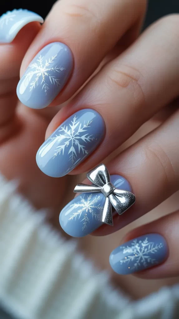 - 13. Blue Snowflake Nails with Silver Bow Accent