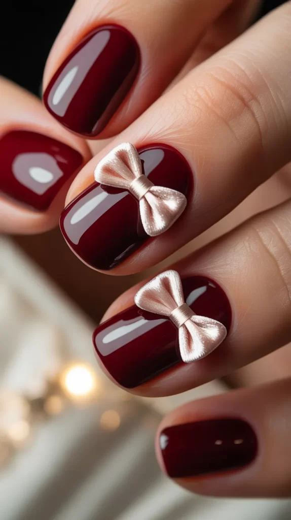 Use a glossy burgundy polish as your base. Then, place soft velvet or fabric bow stickers on one or two accent nails. The texture of the velvet adds depth and luxury to your manicure.