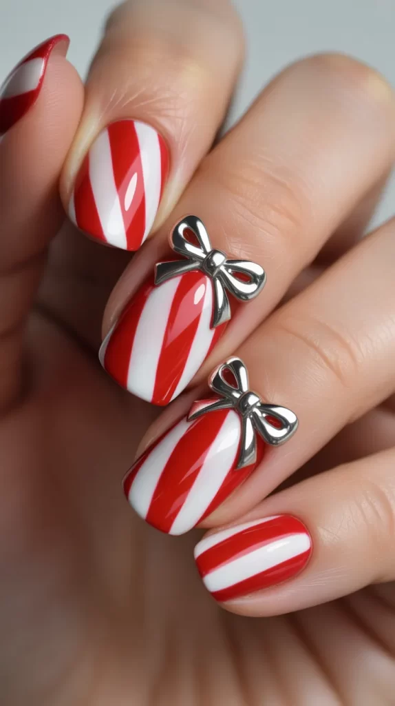 Use alternating red and white stripes as your base to create a candy cane effect. Once dry, paint or apply a small silver or gold bow on one or two accent nails. The result is playful, bright, and full of Christmas cheer.