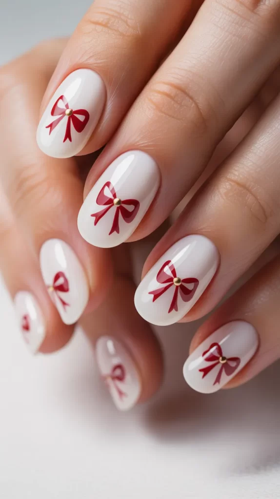 Start with a clean, white matte or glossy base coat on all your nails. Once dry, use a thin nail brush or striping tape to draw a small red bow near the tip or center of your nail. Add a tiny gold dot at the knot for detail. This classic red-on-white design gives off a cozy, Christmas-gift vibe.