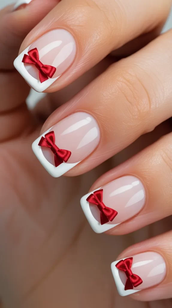 Start with a pale pink or nude base and create a French tip using white polish. Once dry, add a tiny red bow right where the white and nude colors meet. Keep the bows small for a cute and delicate finish.