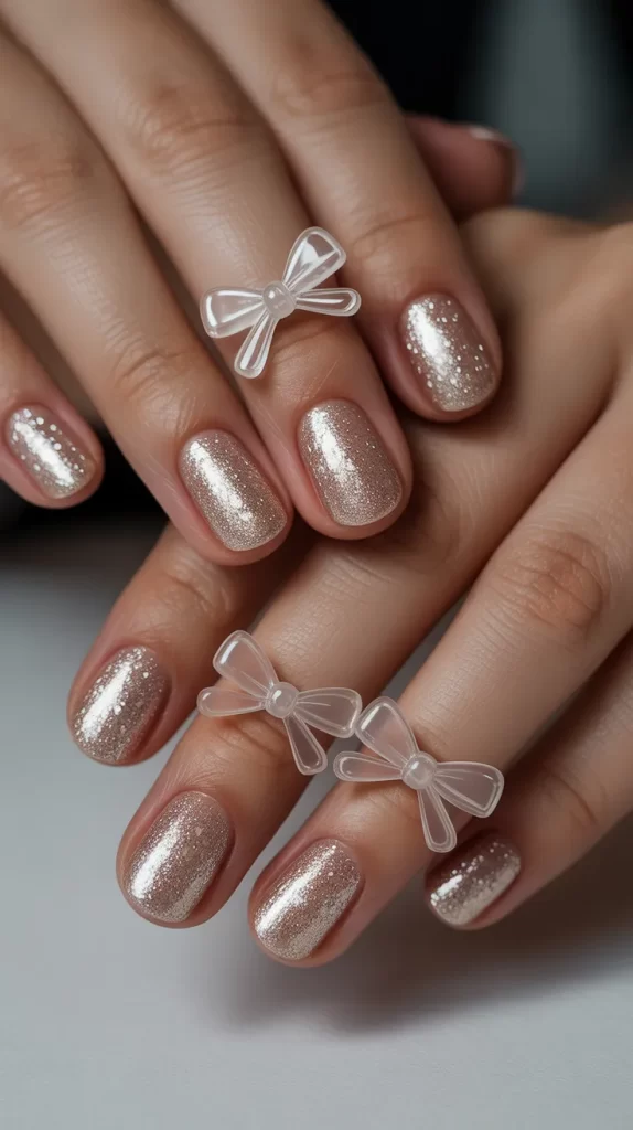 Apply a glitter ombre effect using silver and rose gold glitters, fading from the tips. On top, add a transparent or jelly-style bow sticker for a modern, minimal finish.