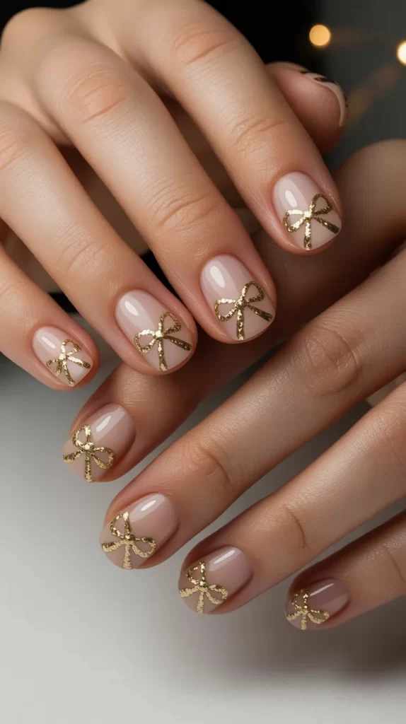 Paint your nails with a soft nude or light pink base coat. Using gold glitter polish, create a bow shape at the tip of each nail. Outline the bow with a fine white or black line for definition, then seal it with a glossy top coat.