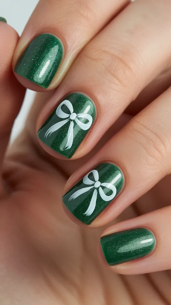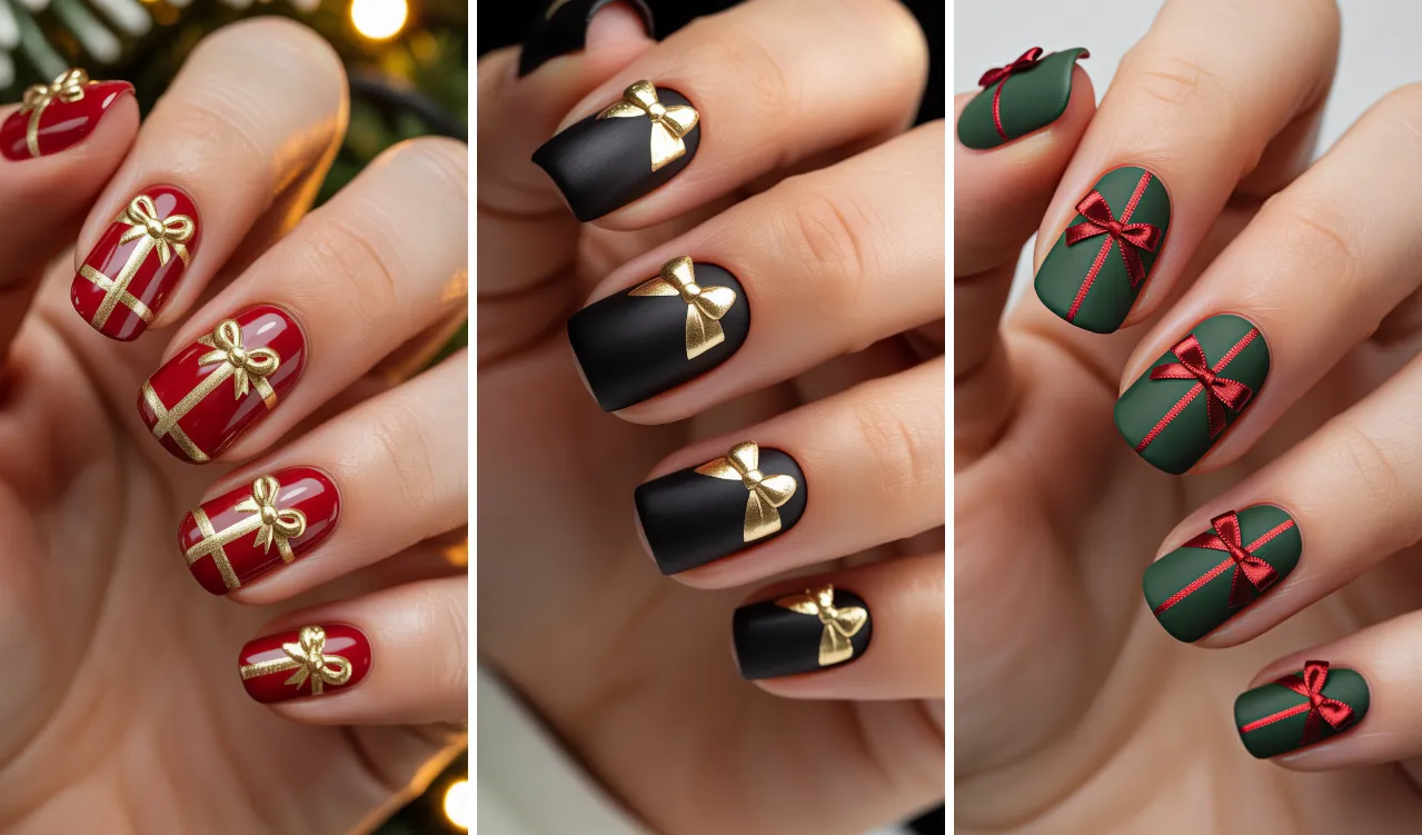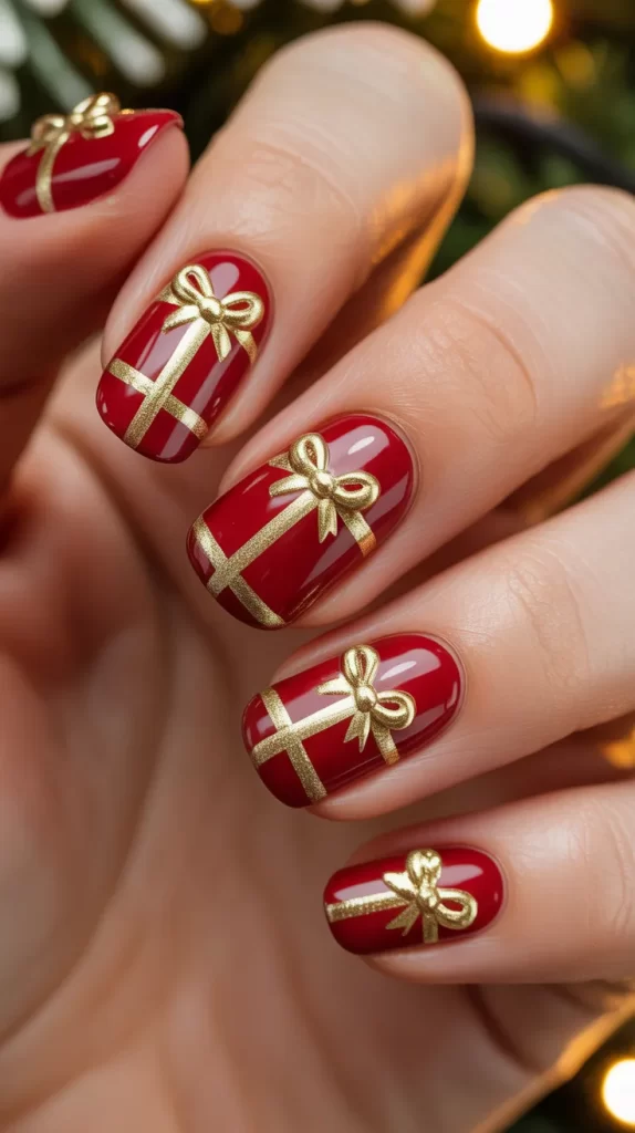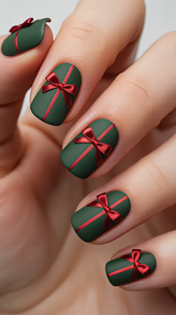 Go for a matte dark green polish as your base. Once it’s dry, use red nail polish or a fine brush to paint a ribbon across the nail with a neat bow in the center. The combination of matte green and shiny red gives a wrapped-gift effect that’s both chic and fun.