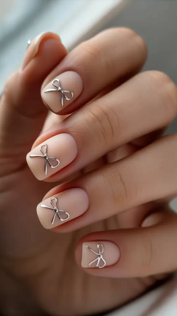 Start with a nude or beige matte polish. Then, use silver polish or foil to create small metallic bows near the tips or sides of your nails. The subtle base makes the metallic pop without being too flashy.