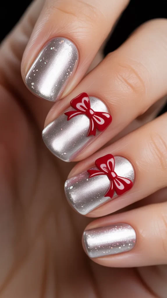 Apply a shiny silver polish as the base on all nails. Once dry, place small 3D bow stickers or rhinestone bows near the cuticle or center. Secure them with a strong top coat to hold them in place.