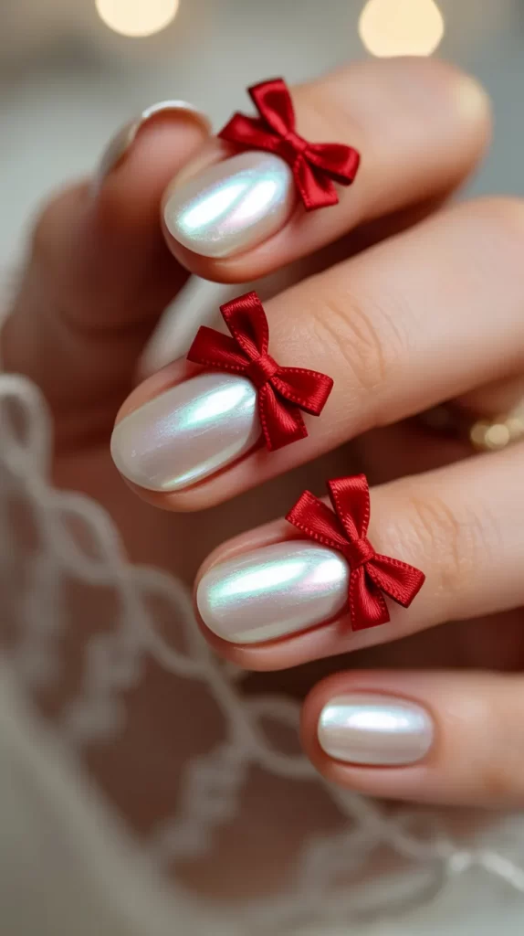 Apply a pearly white polish to all your nails. Then, draw or stick small satin red bows on one or two nails. You can use nail glue or soft fabric bow stickers for an extra realistic look.