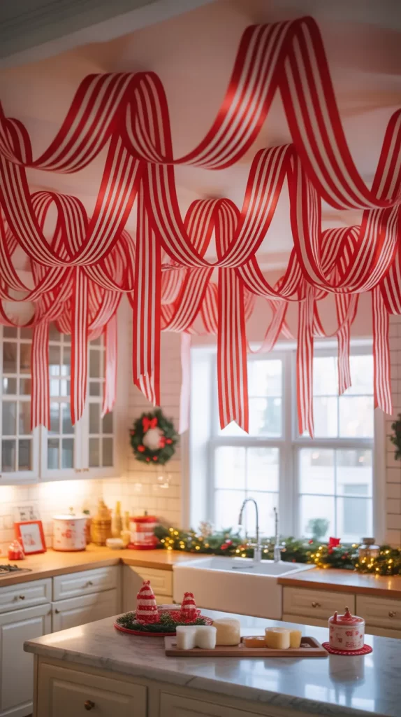 Use red and white ribbons or paper strips to mimic candy cane patterns across your ceiling. This playful idea adds instant color and charm.