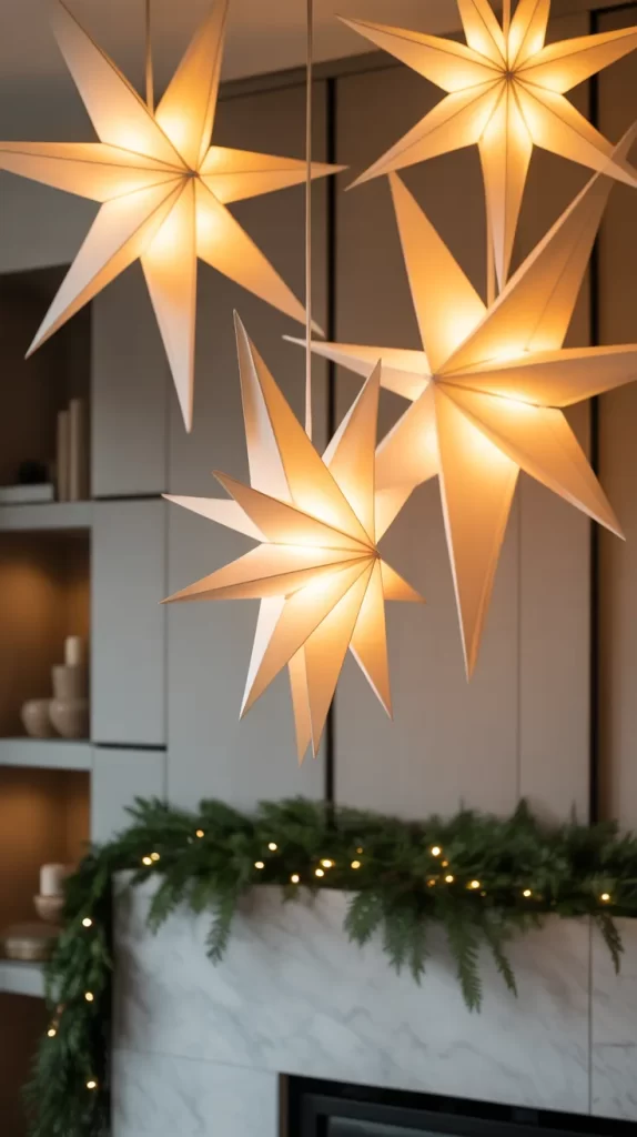 Hang paper star lanterns in white, gold, or metallic shades to illuminate your space. The soft light shining through cut-out patterns adds a magical sparkle.