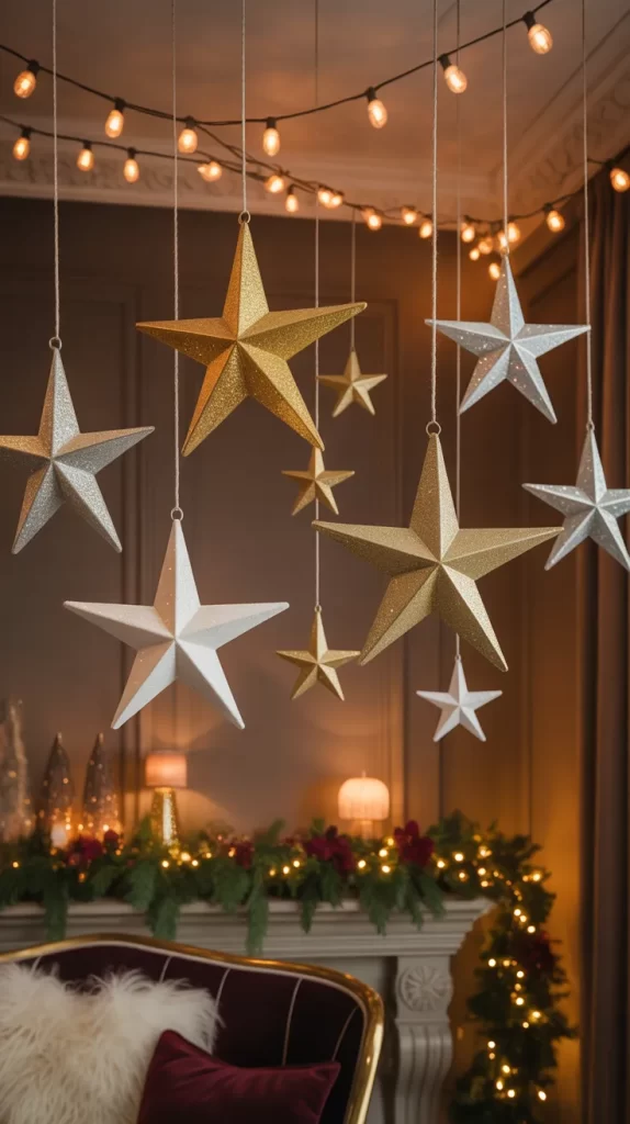 Craft large cardboard stars, coat them with glue, and cover them in glitter. Hang them in clusters for a dramatic, shining ceiling effect.
