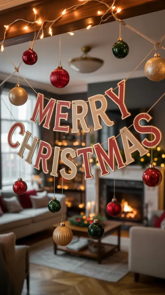 Finish with festive “Merry Christmas” or “Let It Snow” banners stretched across your ceiling. Add fairy lights or hanging ornaments along the string for a complete holiday touch.