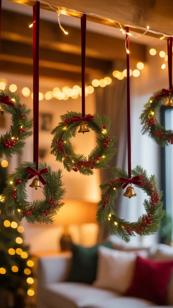 Mini wreaths aren’t just for doors! Hang small wreaths from the ceiling with elegant ribbons. Use matching ornaments or fairy lights for added beauty.