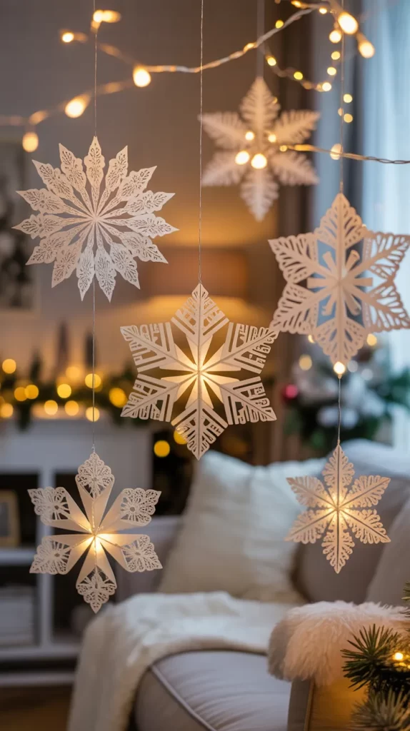 Turn your ceiling into a snowy dream! Cut out white paper snowflakes in different sizes and hang them using clear fishing wire. The floating snowflakes create a soft, wintry charm that feels magical under warm lights.