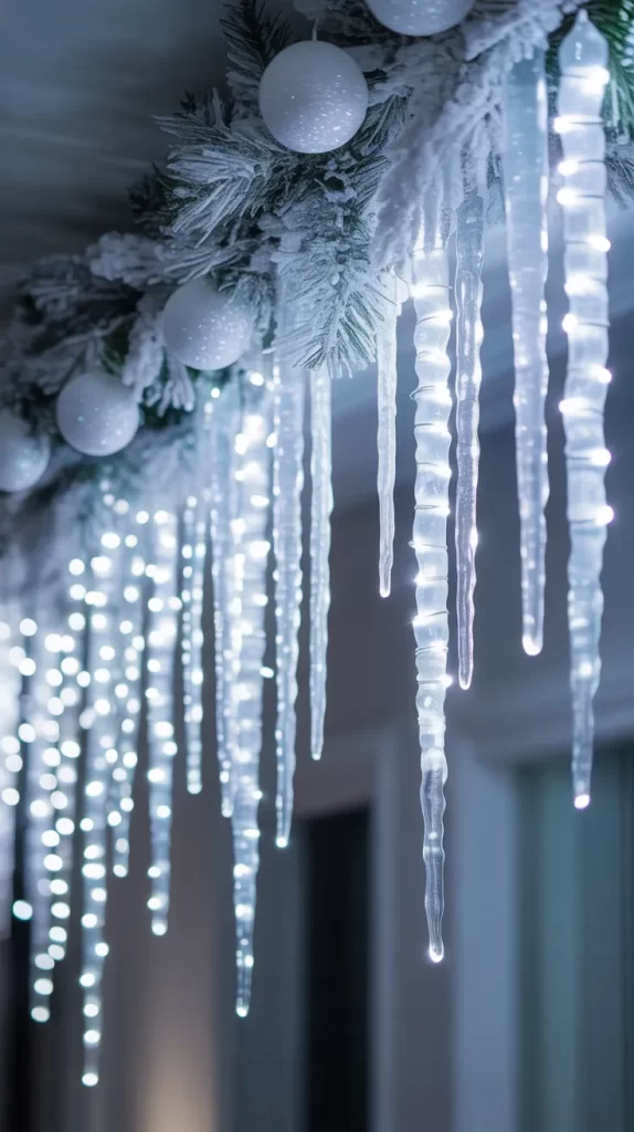 Hang icicle lights from the ceiling to mimic frozen winter magic. The cascading lights add an elegant, snowy sparkle.