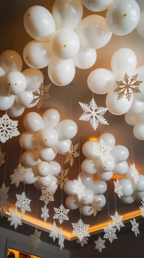 Create “snow clouds” using white balloons grouped together, with paper snowflakes hanging underneath. It gives your room a floating winter look that’s both cute and creative.