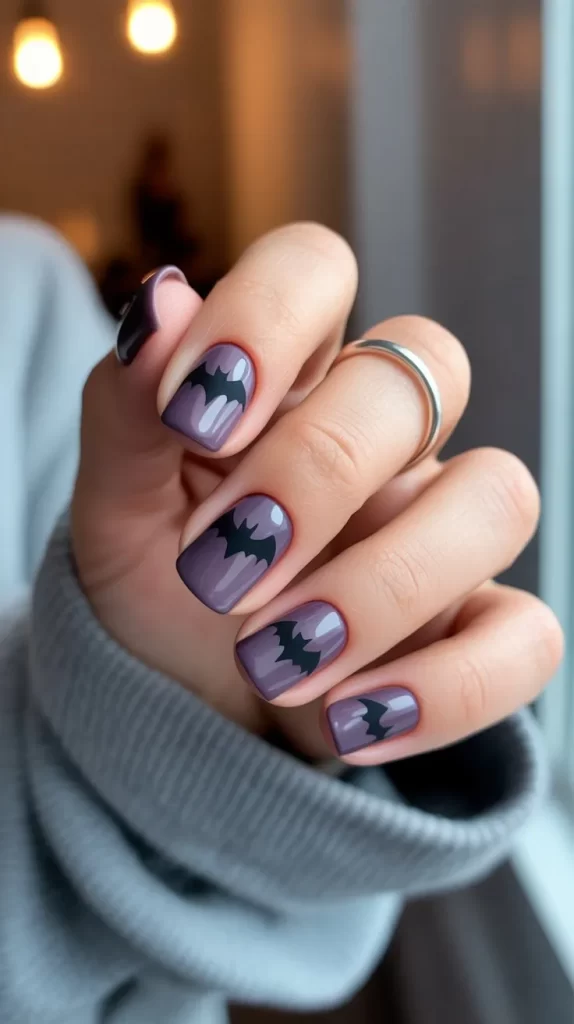 Bats are a classic Halloween symbol. Paint nails in dark purple or black and add simple bat shapes on accent nails. Use nail stickers or a fine brush to save time.