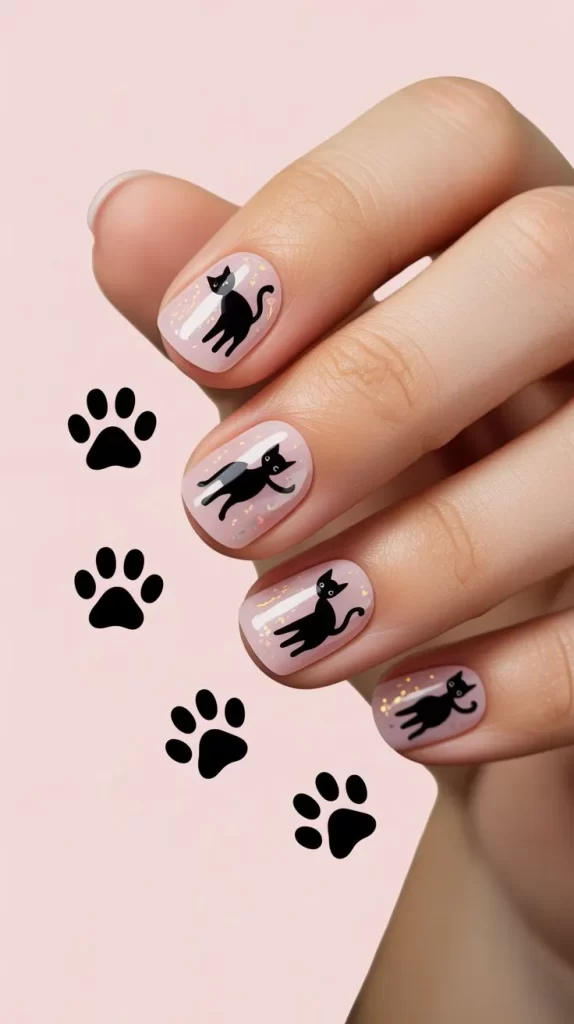 Show your love for Halloween with black cat silhouettes. Paint nails in a bright or pastel color and add small black cat shapes on one or two accent nails. Simple stencils can help make it easier.
