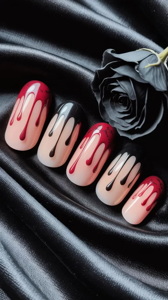 Create a dramatic effect with blood drip designs. Paint nails in white or pale pink, then add red nail polish dripping from the tip. You can use a thin brush or dotting tool for realistic drips.
