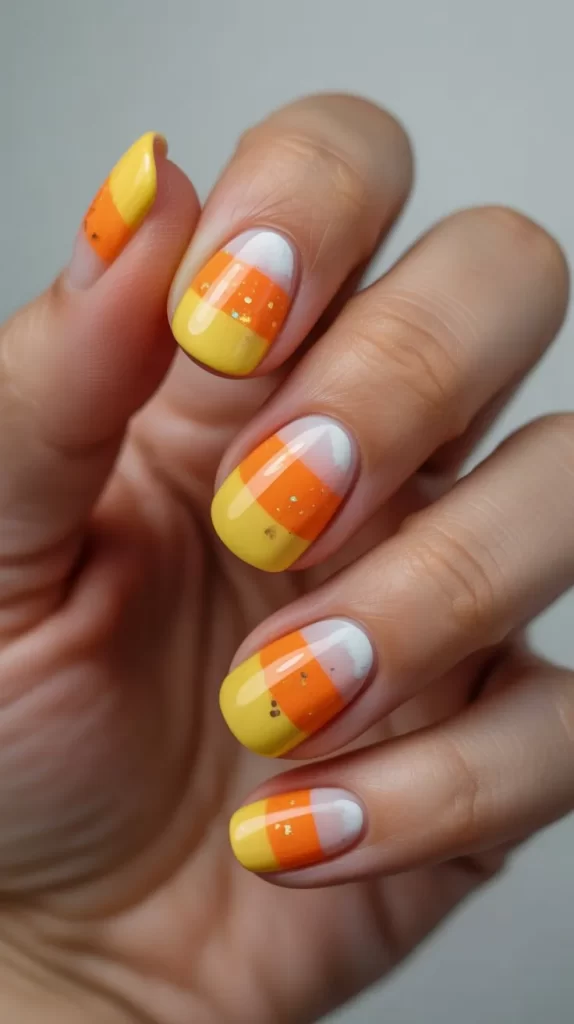 Celebrate Halloween candy with candy corn-inspired nails. Paint each nail in yellow, orange, and white stripes resembling candy corn. This cheerful design is easy to create and perfect for beginners.