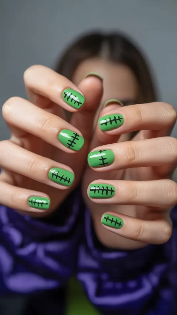 Frankenstein nails are fun, quirky, and ideal for easy Halloween nails. They are simple to create with basic colors and tools, giving your look a cute and spooky charm. Perfect for last-minute Halloween plans.