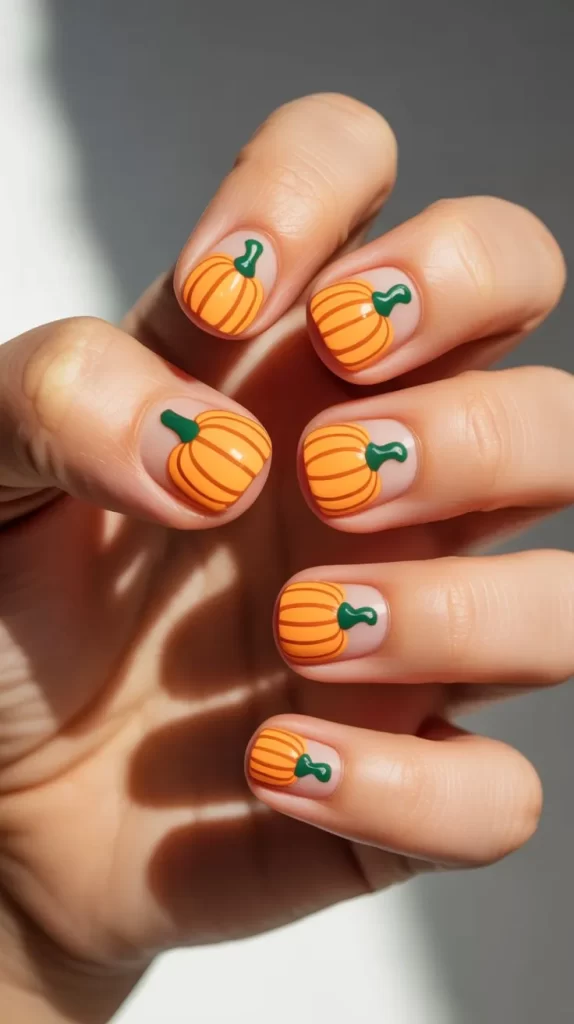 Transform your nails into tiny pumpkins by painting them orange and adding a small green stem at the base. This adorable design is fun and easy for beginners. You can alternate plain orange nails with pumpkin designs for a quick, cute look.