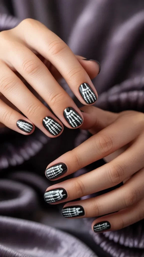 Create a spooky effect with skeleton hand nails. Paint nails black or dark gray, then add white bone shapes or small skeleton fingers on accent nails. Stickers can make it faster.