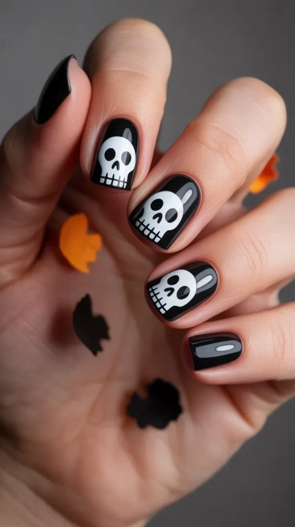 Go spooky with tiny skull designs. Paint nails in black, white, or gray, and draw simple skull faces using a dotting tool. Accent nails can have glitter or small bones for variation.
