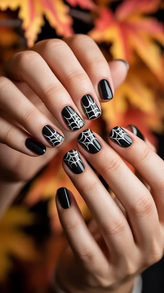 Add a little creep factor with spider web designs. Paint your nails black or dark purple and draw fine white spider webs on one or two accent nails. You can use a thin brush or nail sticker for ease.