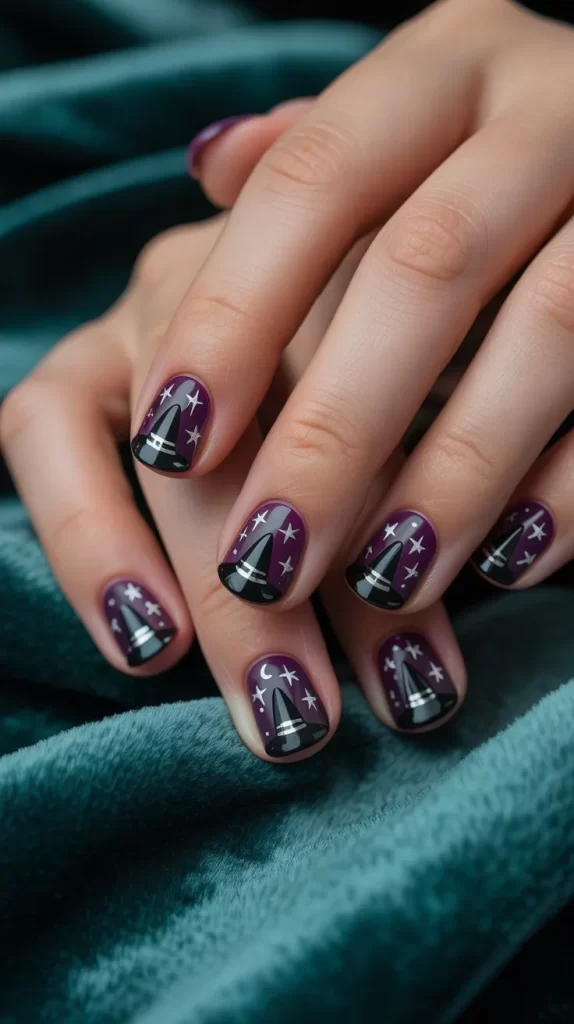 Witch hat nails are perfect for busy people wanting easy Halloween nails that are festive and fun. They are simple to make and look charming for Halloween-themed events or parties.