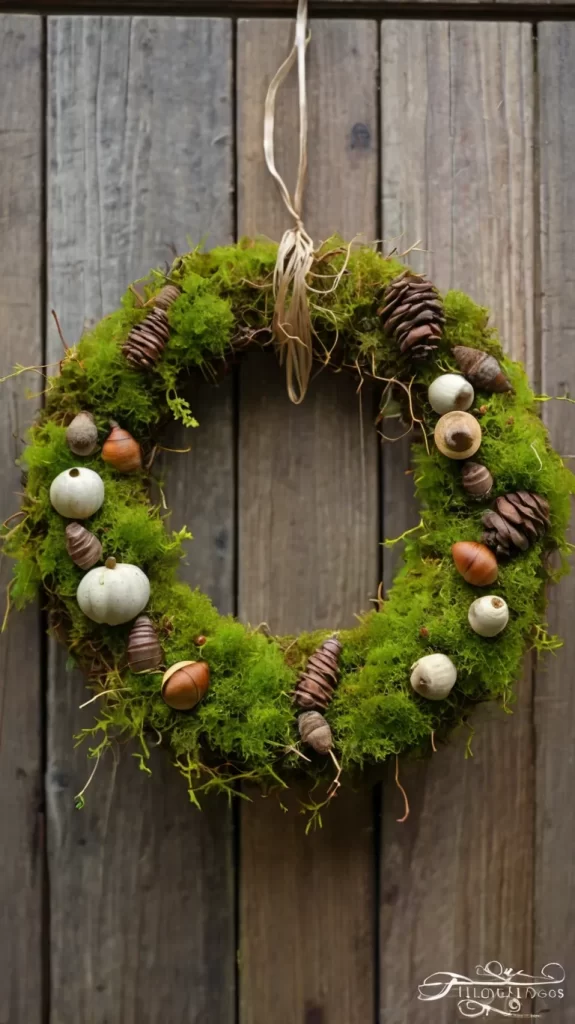 Earthy and textured, this wreath showcases acorns, moss, and bark.