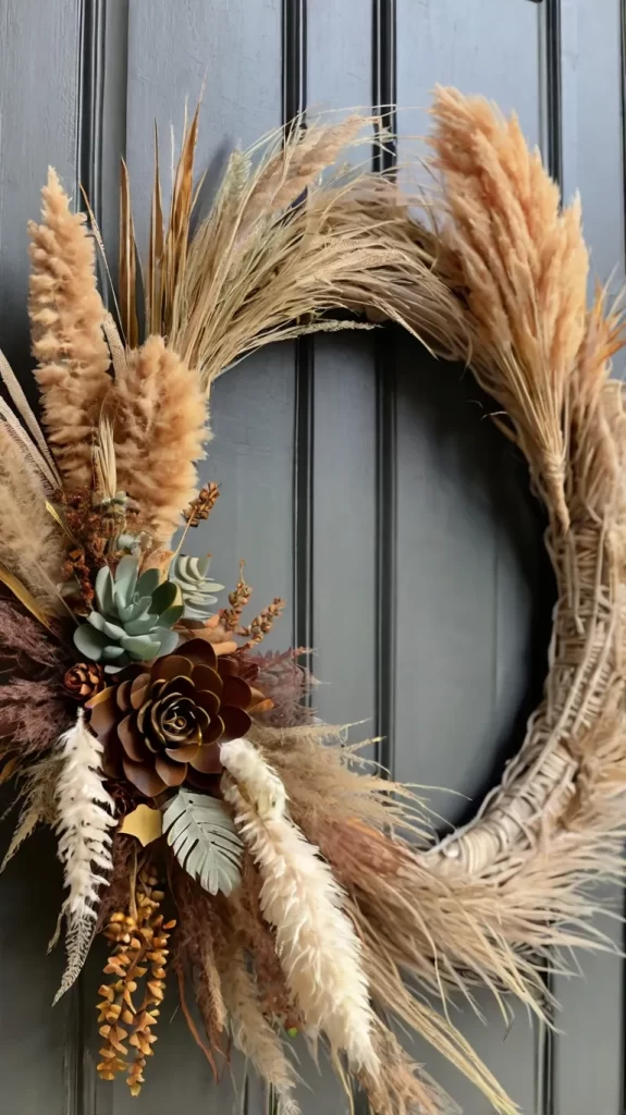 A trendy, neutral‑toned wreath made entirely from pampas grass and dried florals.