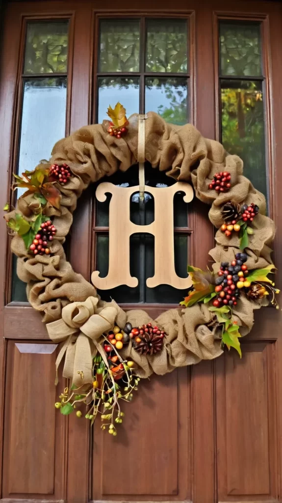 Add a personal touch with a large wooden initial on a burlap-wrapped wreath.