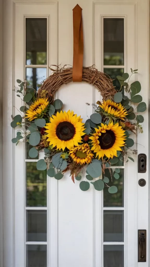 Bright and airy, this wreath combines large sunflowers with sprigs of faux eucalyptus for a sunny autumn feel.