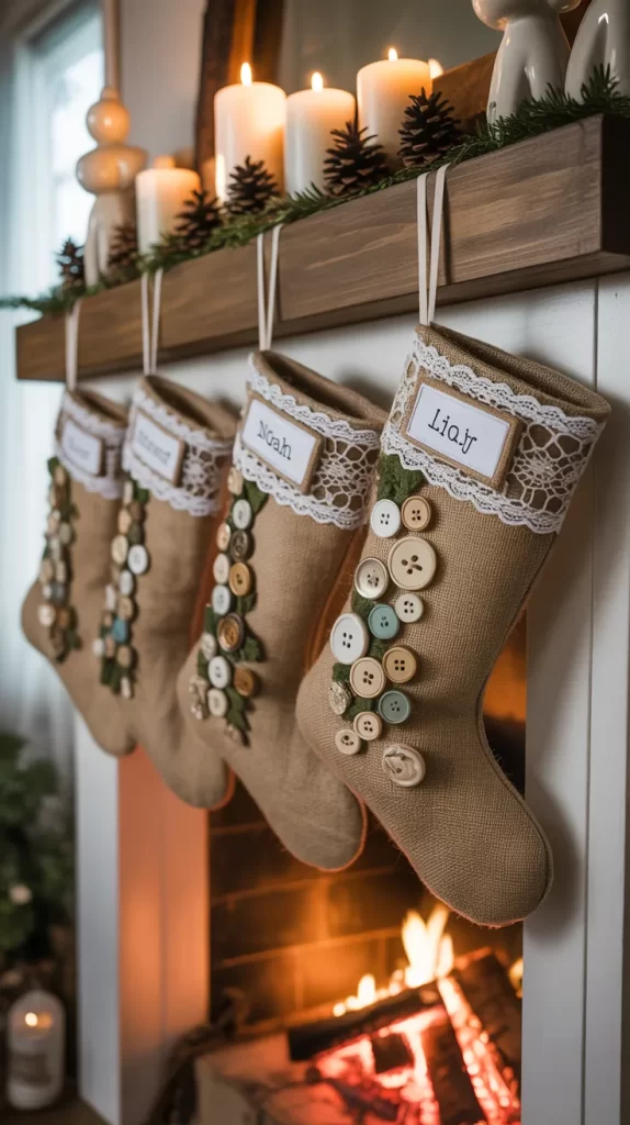 Skip the store-bought stockings and make your own using burlap fabric. Cut stocking shapes, sew or glue them together, and decorate with lace, buttons, or plaid patches. Burlap gives that authentic farmhouse texture that fits perfectly with rustic decor.