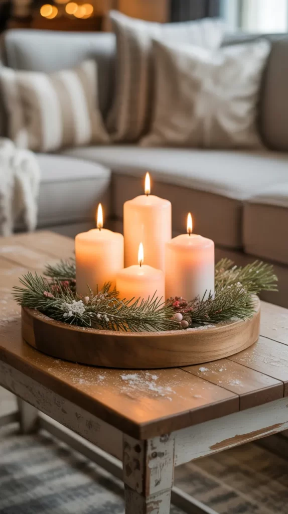Arrange candles of different sizes on a wooden tray with pine branches, cinnamon sticks, and faux snow. Use white and beige candles for a soft, cozy glow.