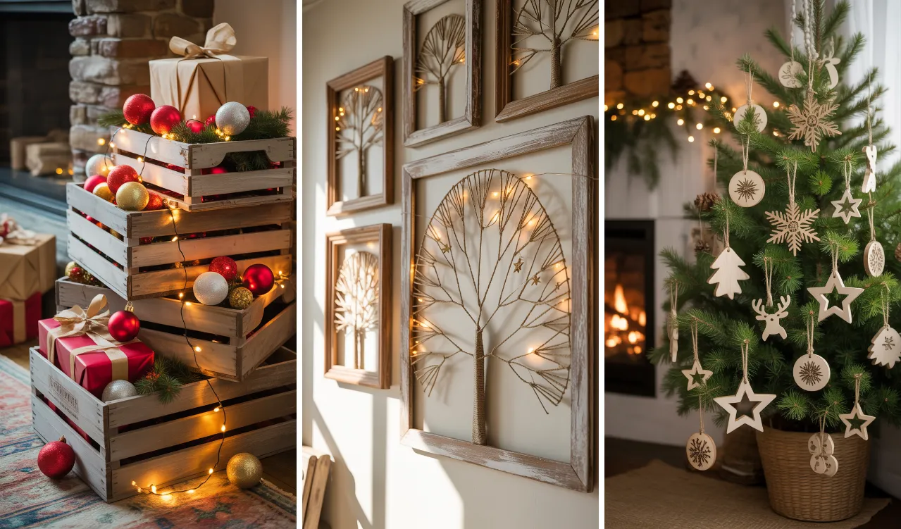 Make your own wall art using wooden frames, nails, and twine. Hammer small nails in a triangular shape (like a tree) and wrap twine around them to form a rustic Christmas tree outline.