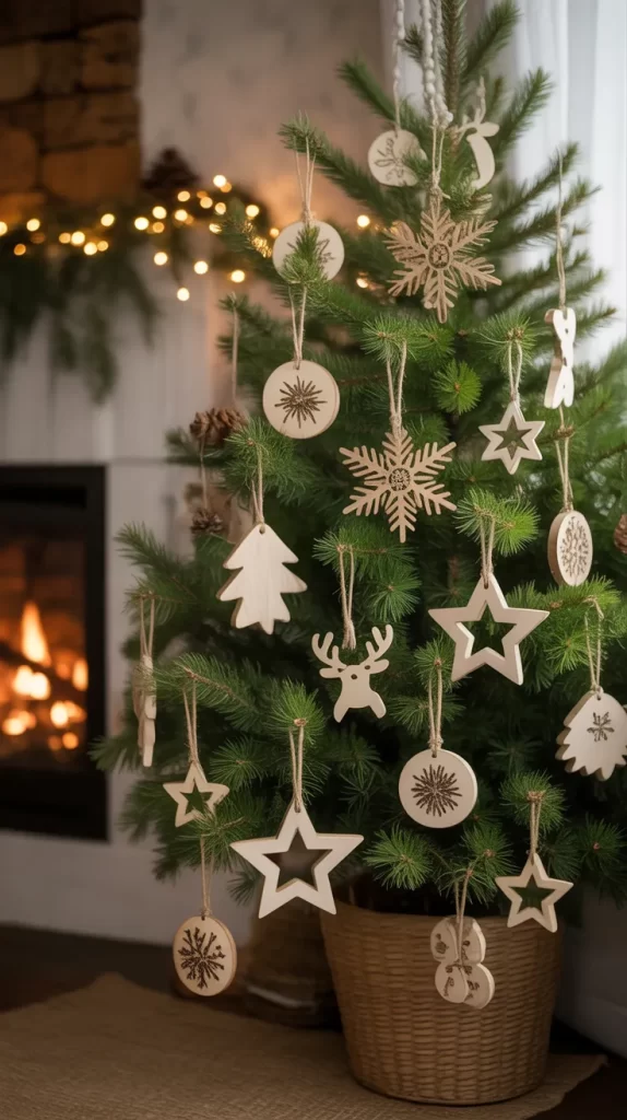 Create ornaments using wood slices, twine, and natural elements. Write festive words like “Joy” or “Peace” on wood slices using paint or markers. You can also glue on small pinecones, buttons, or dried flowers.