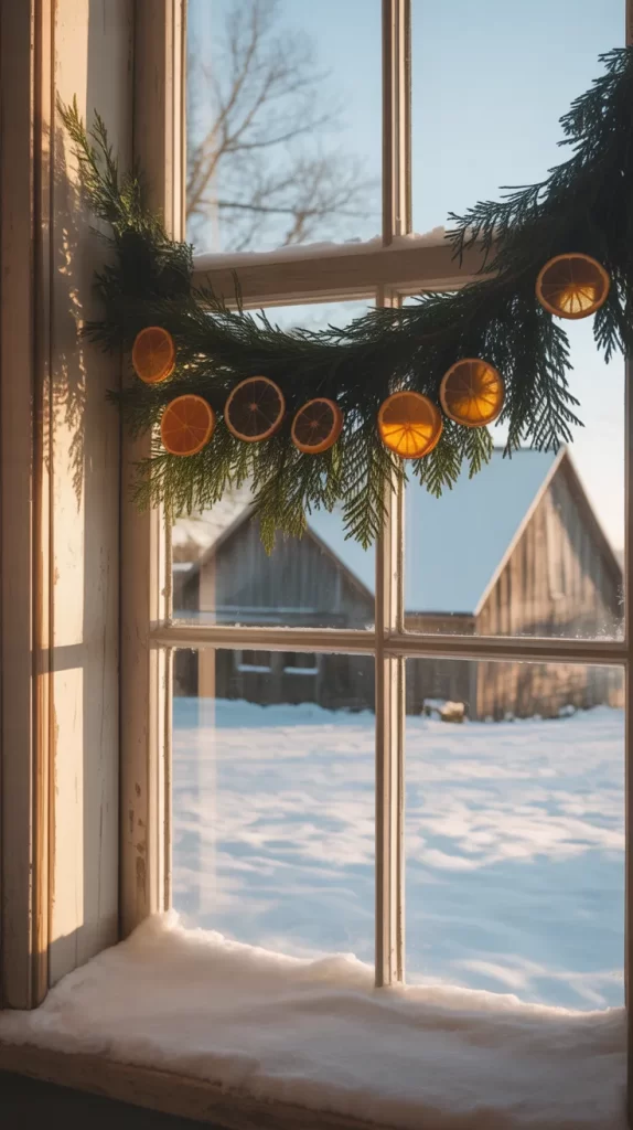 For a natural farmhouse touch, make a garland from dried orange slices. Slice oranges thinly, bake them until dry, and string them together with twine.