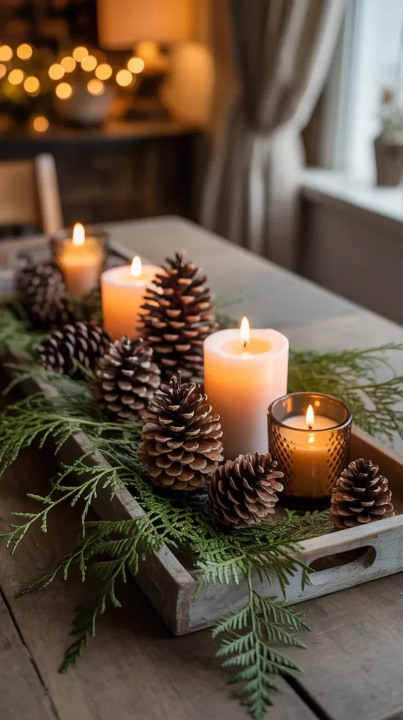 Gather pinecones, candles, and wooden trays to create a simple yet beautiful centerpiece. Paint some pinecones white or dust them with glitter for a snowy look.