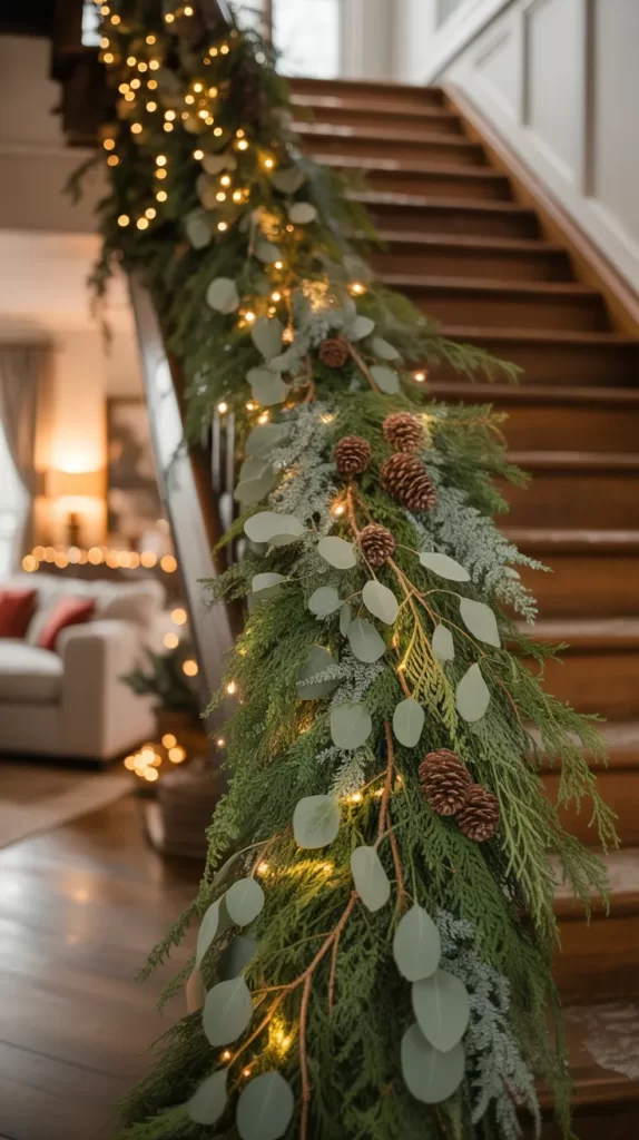Make your own garland using fresh pine branches, eucalyptus, and twine. Add pinecones, white berries, or dried oranges for texture. Drape it along your staircase, mantel, or dining table centerpiece.