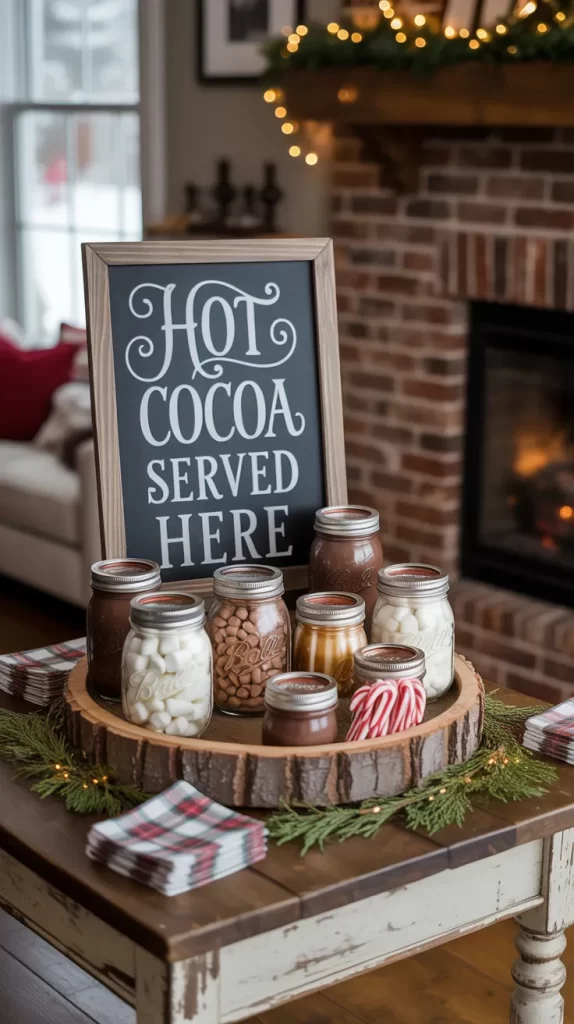 Set up a cozy hot cocoa bar using a wooden tray, mason jars for toppings, and a chalkboard sign that says “Hot Cocoa Served Here.” Decorate with pine branches, plaid napkins, and mini candy canes.