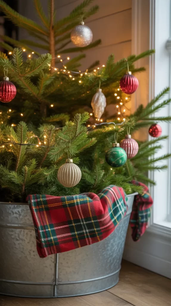 Instead of a traditional tree skirt, place your Christmas tree in a galvanized metal bucket or tub. Add some plaid fabric or burlap inside for texture.