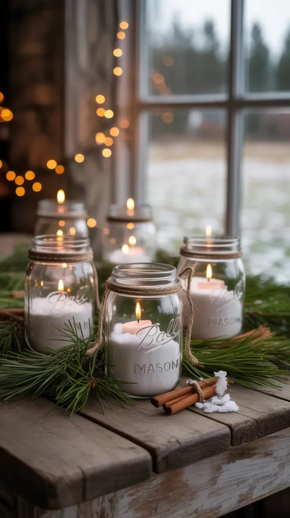 Mason jars are a farmhouse favorite! Turn them into candle holders by filling them with Epsom salt (to look like snow) and placing a tealight or LED candle inside. Tie a piece of twine or burlap ribbon around the top and add a small pine branch or cinnamon stick.