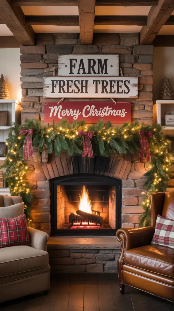 Nothing says farmhouse charm like a handmade wooden sign. Find an old wooden board or pallet piece, sand it down, and paint phrases like “Merry Christmas,” “Farm Fresh Trees,” or “Joy to the World.” You can stencil the letters or freehand them for a personal touch.