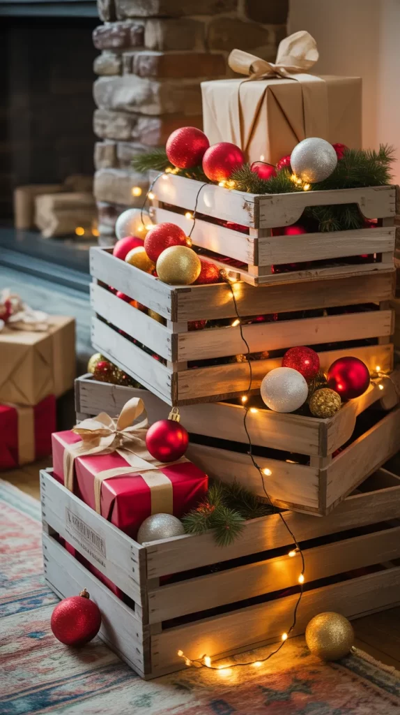 Instead of a traditional Christmas tree stand, use stacked wooden crates to display ornaments and gifts. Arrange crates at different heights, fill them with greenery, lights, and small decor pieces.