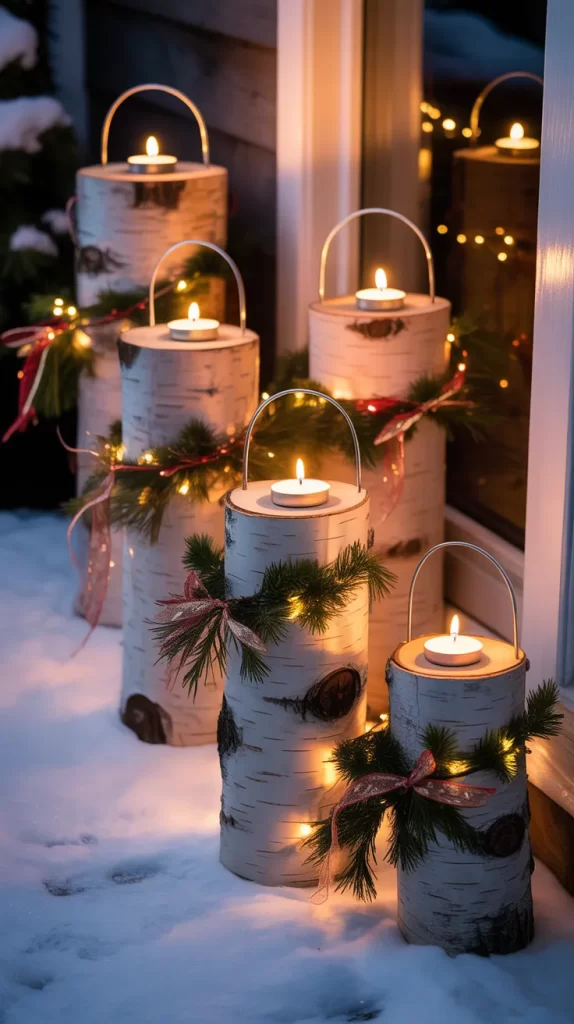 Cut birch logs into small pieces and hollow out the centers to fit tea lights. Arrange them in groups on your porch or steps. When lit, they create a soft, natural glow.